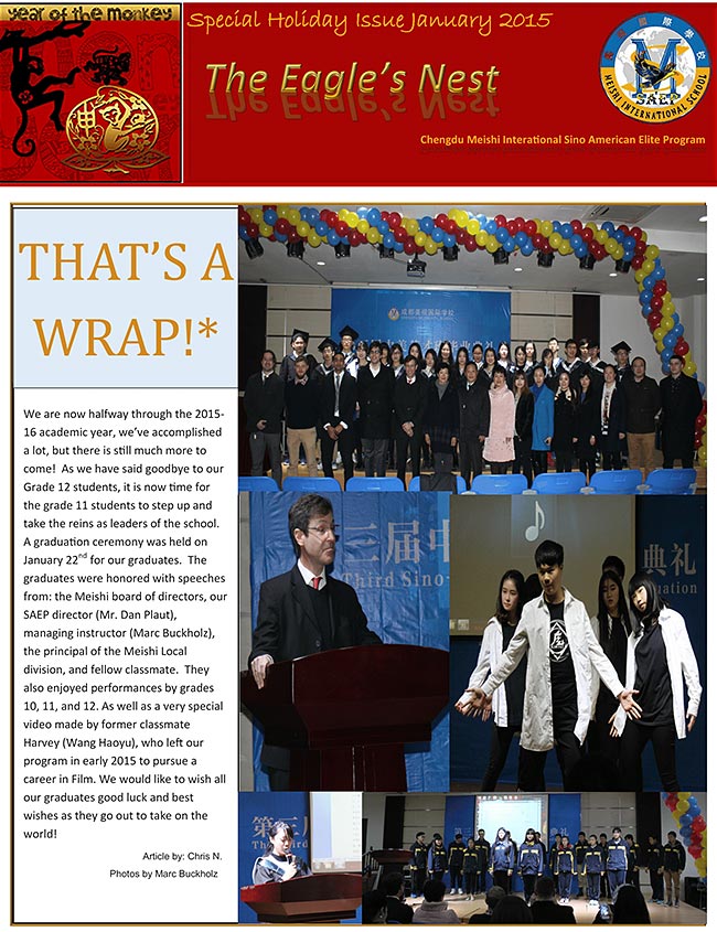 2015-2016學(xué)年已過(guò)去一半,我們圓滿(mǎn)完成了許多事情,但還有更多等待著我們。告別了高三的同學(xué)們,現(xiàn)在輪到高二同學(xué)們開(kāi)啟他們的高三生活了。2016119日,我們舉行了第三屆中美英才班畢業(yè)典禮。美視學(xué)校董事長(zhǎng)陳總,中美英才班主任Dan Plaut先生,中美英才班首席教師Marc Buckholz, 美視中學(xué)部校長(zhǎng)徐德雄先生分別為畢業(yè)生們送上了祝愿。在典禮上,中美英才班畢業(yè)生代表分別表達(dá)了他們的感激之情。此外,大家還欣賞到了由高一,高二,高三同學(xué)為大家準(zhǔn)備的節(jié)目。Harvey Wang Sophie Zhang 也為此次畢業(yè)典禮制作了一段特別的視頻。我們衷心祝愿高三畢業(yè)生們國(guó)外生活一切順利。