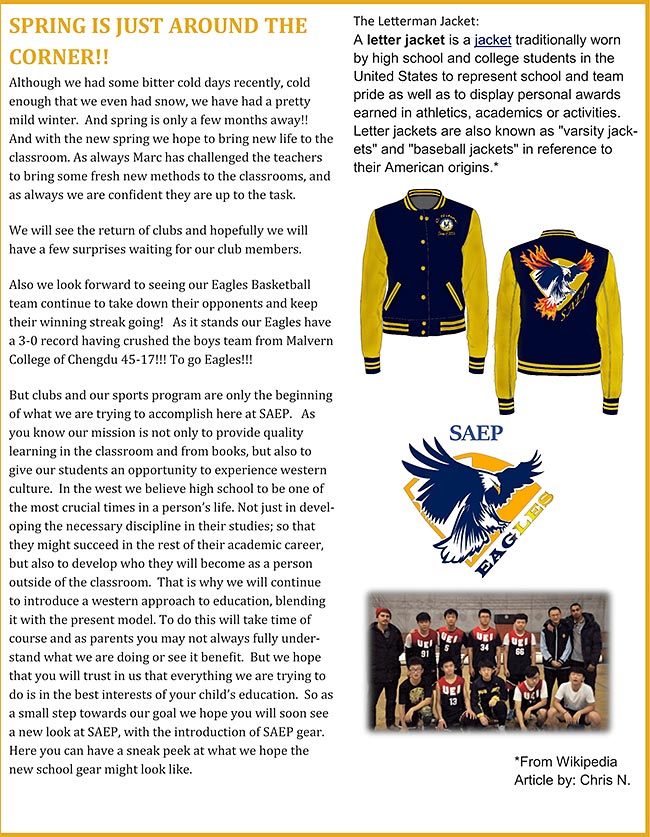 中美英才班俱樂(lè)部和體育隊(duì)只是我們一直所做的開(kāi)始。正如你所了解的,我們的目標(biāo)不僅僅只是在課堂上提供優(yōu)質(zhì)教學(xué),還有提供讓同學(xué)們體驗(yàn)西方文化的機(jī)會(huì)。在西方,我們認(rèn)為高中時(shí)代對(duì)于一個(gè)人的一生來(lái)說(shuō)是最重要的時(shí)期之一。不僅僅是培養(yǎng)他們必要的學(xué)習(xí)習(xí)慣,保證順利完成之后的學(xué)業(yè),還有讓同學(xué)們了解自己在課堂之外想要成為怎樣的人。這就是我們?yōu)槭裁匆^續(xù)將西方的方法引入我們的教學(xué)當(dāng)中,變成適合我們自己特色的教學(xué)模式。我們所做的都需要時(shí)間來(lái)證明,有的家長(zhǎng)可能不能完全理解我們現(xiàn)在所做的或者看不到有益的東西。但我們希望各位家長(zhǎng)給予信任,因?yàn)槲覀儸F(xiàn)在所做的一切都是有益于您孩子的學(xué)習(xí)成長(zhǎng)。向著目標(biāo)前進(jìn)的每一小步都是希望家長(zhǎng)們以后看到一個(gè)不一樣的中美英才班。