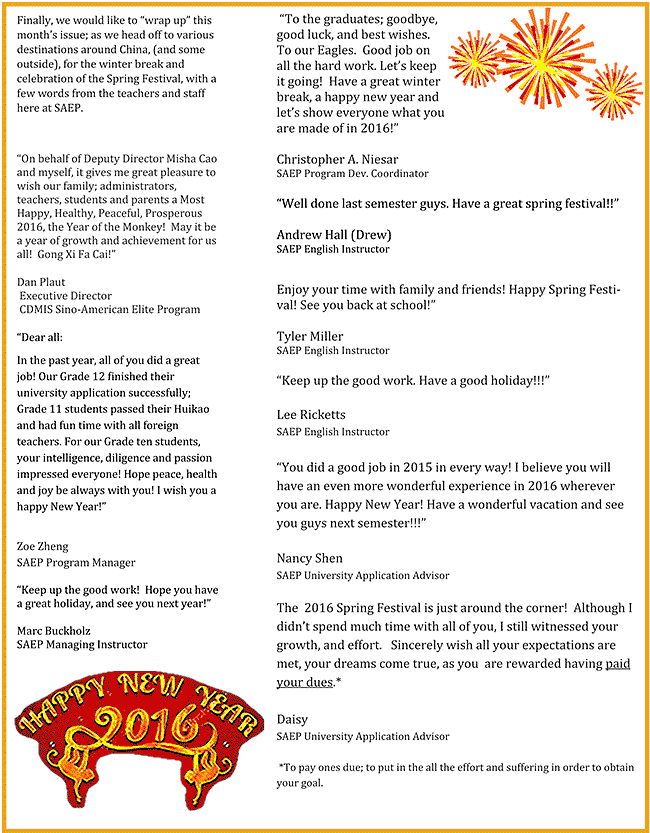 同學(xué)們,在2015年,你們?cè)谡n堂內(nèi)外各方面都表現(xiàn)得非常棒!我相信在2016年,無(wú)論是繼續(xù)高中學(xué)業(yè)的高一、高二同學(xué),還是即將準(zhǔn)備出國(guó),踏上新旅程的高三同學(xué),都會(huì)有更精彩的經(jīng)歷。希望高三的同學(xué)們能夠成長(zhǎng)的更加努力,更加自立!祝大家新年快樂(lè)!寒假玩得開(kāi)心,咱們下學(xué)期見(jiàn)~ !