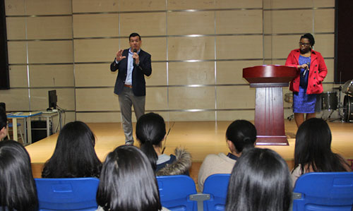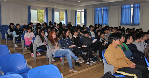 在國際部禮堂里,來自美國佛羅里達(dá)大學(xué)和諾瓦東南大學(xué)的校方代表為同學(xué)們帶來了關(guān)于申請美國大學(xué)流程的講座。