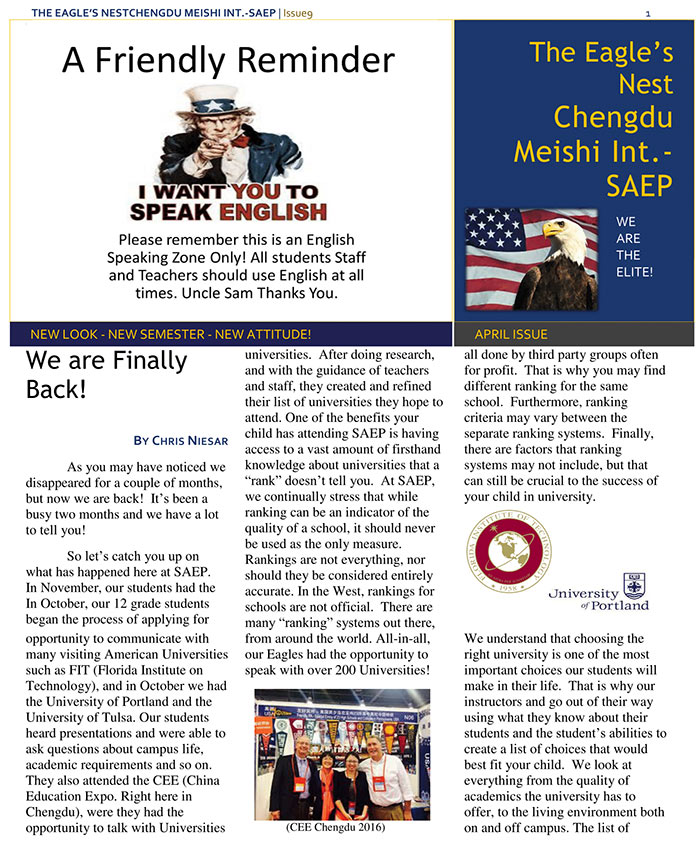 10月和11月,來自美國的多所大學(xué)(如:塔爾薩大學(xué)、波特蘭大學(xué)、佛羅里達(dá)理工學(xué)院等等)來訪中美英才班,與同學(xué)們面對面暢談。見面會(huì)上,同學(xué)們就他們所關(guān)心的校園生活、申請要求等方面詳細(xì)地向招生代表們進(jìn)行了現(xiàn)場咨詢。此外,在成都舉辦的中國教育展上,所有中美英才班的同學(xué)們與來自于世界各國超過200所大學(xué)的招生官近距離接觸,向他們了解更多相關(guān)申請信息和要求。