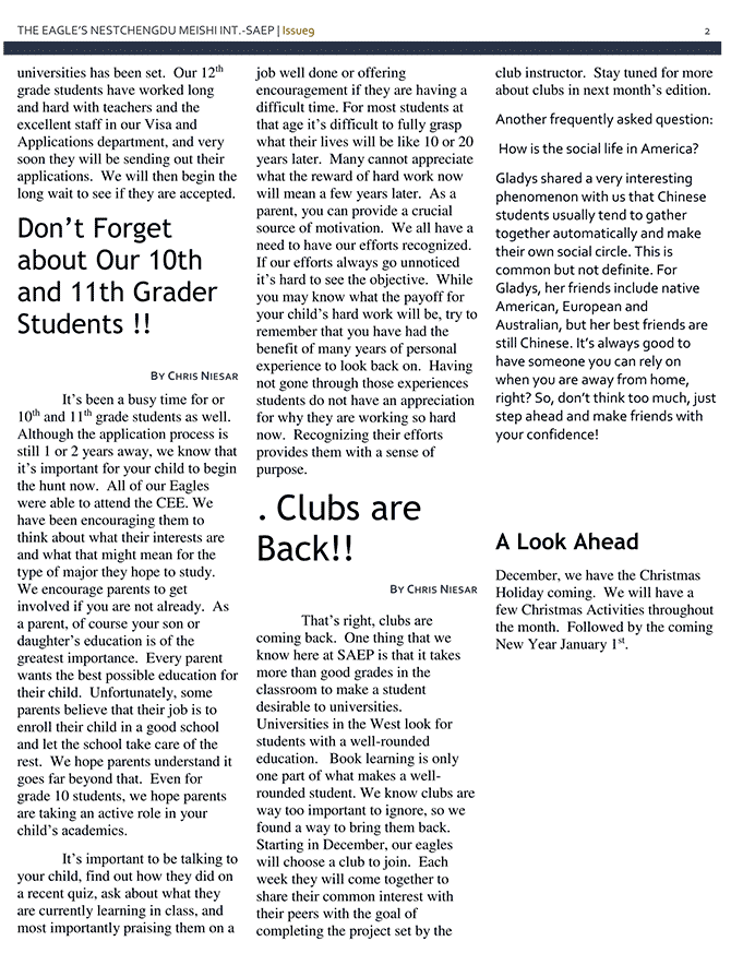 國外大學(xué)希望所招收的學(xué)生是綜合全面發(fā)展的。但書本知識(shí)只是全面發(fā)展的一個(gè)組成部分。課外實(shí)踐活動(dòng)也是不可或缺的,而通常學(xué)生俱樂部的重要性卻往往容易被忽視,所以我們盡最大努力讓它繼續(xù)開展下去。從12月開始,同學(xué)們將自由選擇一個(gè)感興趣的俱樂部加入。每周,擁有共同興趣愛好的同學(xué)將一起完成由俱樂部老師安排的項(xiàng)目。更多俱樂部信息,請關(guān)注下期鷹之巢。