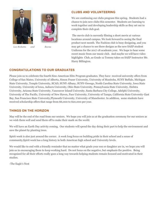 隨著春季學(xué)期的開(kāi)始,中美英才班又有哪些新鮮事兒呢?多所國(guó)外大學(xué)來(lái)訪中美英才班、2017屆畢業(yè)生畢業(yè)典禮、高二同學(xué)們的大學(xué)申請(qǐng)、新外教的加入等等。
