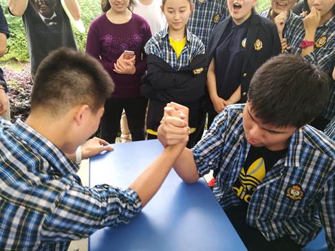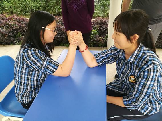 拔河項(xiàng)目結(jié)束之后,新一輪的力量競(jìng)賽再次拉開序幕——扳手腕。兩人對(duì)立而坐,將雙手放于臺(tái)面,各出一只手立于桌面相握。雙方積蓄力量,蓄勢(shì)待發(fā),在圍觀同學(xué)們的驚嘆聲、吶喊聲中,比賽進(jìn)行的如火如荼、熱火朝天。