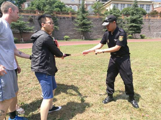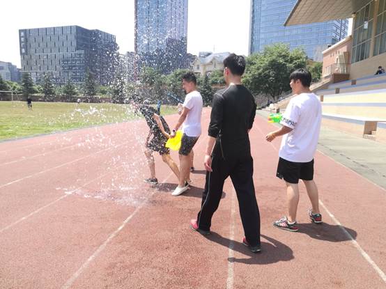 同學(xué)們被分為兩隊(duì),大家對(duì)立而坐,各隊(duì)均有一名投手,負(fù)責(zé)向?qū)Ψ酵稊S水球。隨著兩隊(duì)賽事的結(jié)束,毫不知情且毫無察覺的同學(xué)們?cè)馐芰藖碜酝饨痰?ldquo;突襲”,外教們從角落里一涌而出,舉著水槍向同學(xué)們奔來,四散逃走的同學(xué)們?cè)诜磻?yīng)過來之后,發(fā)起了“反攻”,歡聲笑語傳遍每個(gè)角落。