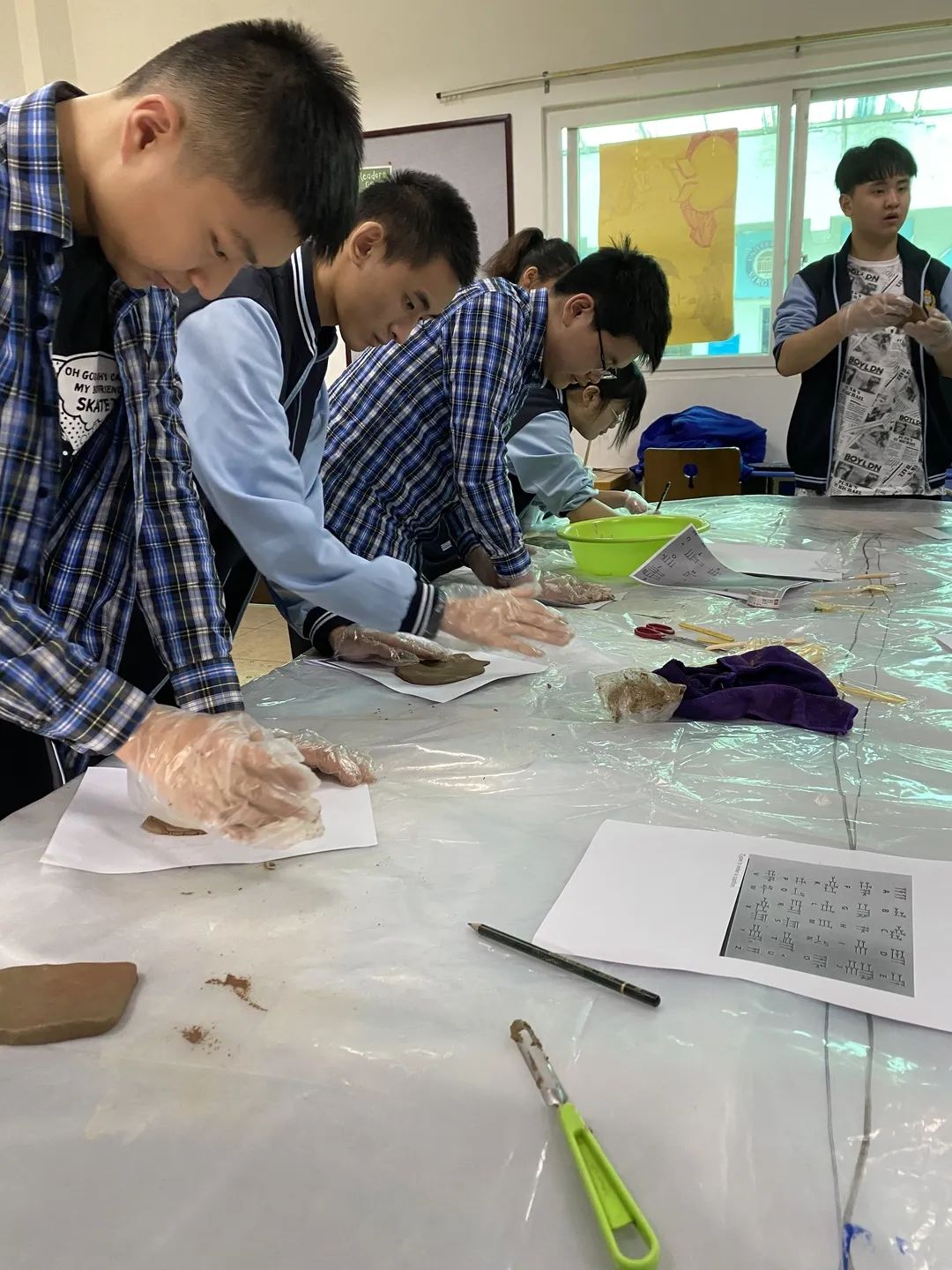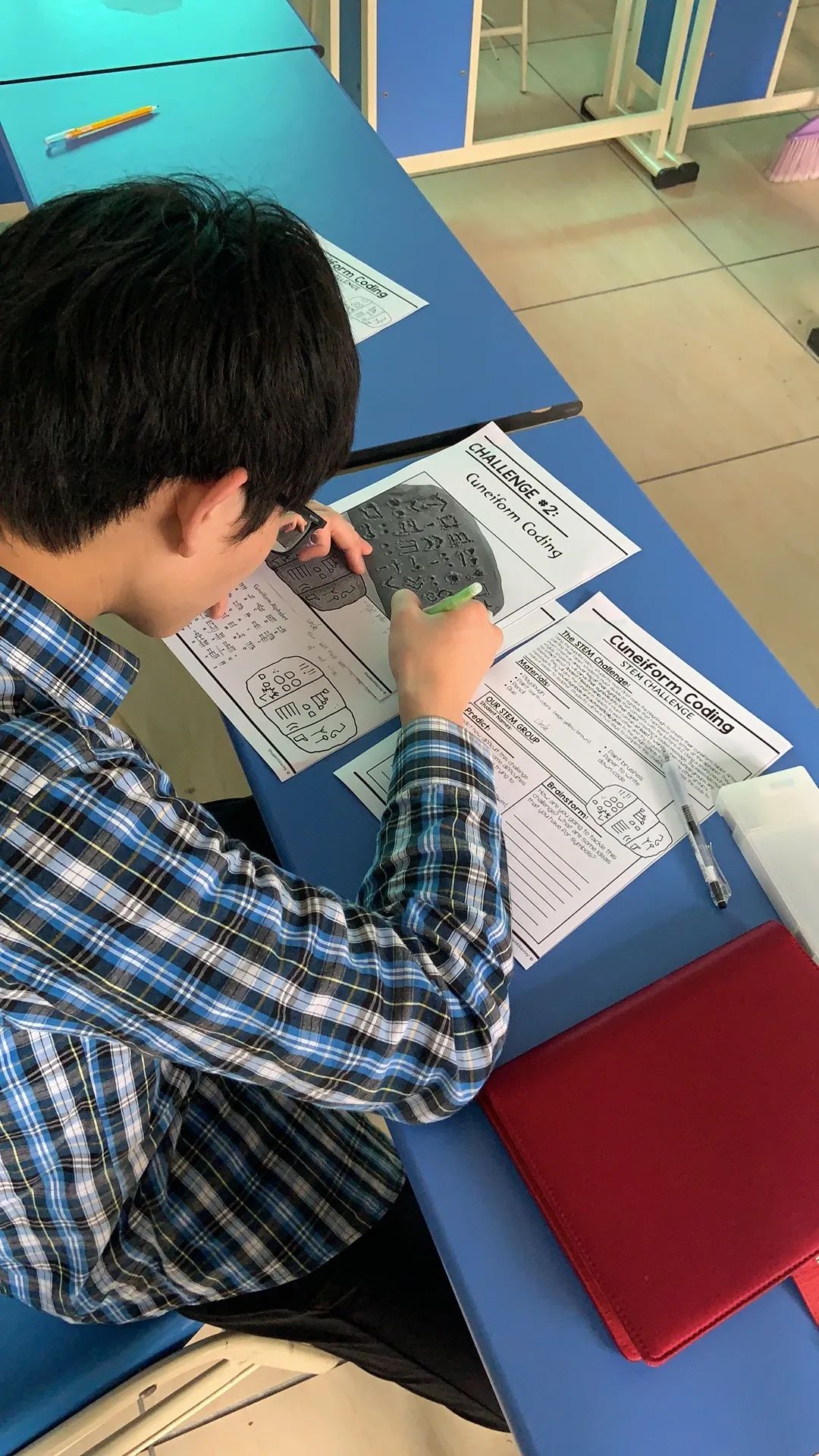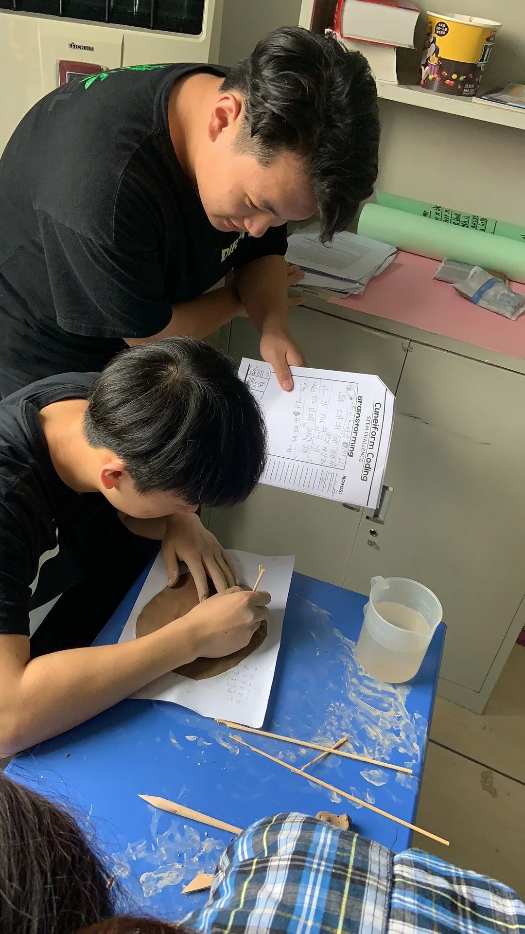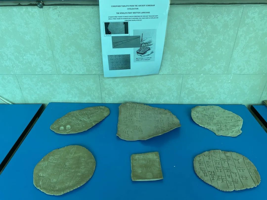 本次活動同學(xué)們的任務(wù)是兩人一組將楔形文字寫在泥板上,然后這些文字將作為線索,供之后的游戲使用。