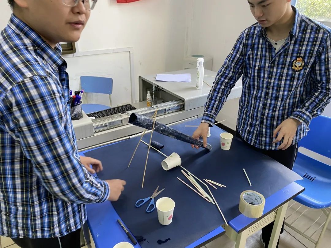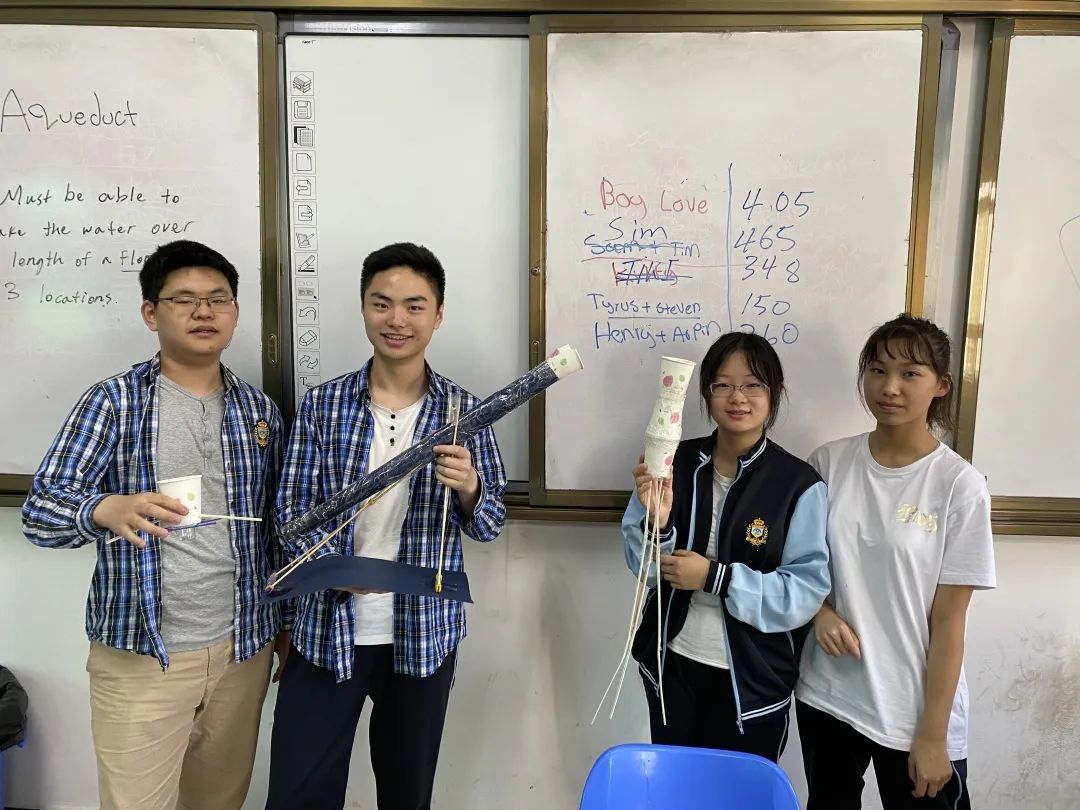 此次挑戰(zhàn),同學(xué)們需要設(shè)計(jì)一個(gè)能將水從源頭傳輸?shù)街辽偃齻€(gè)不同地點(diǎn)的渡槽。引水渠必須高效,不能有任何漏洞。制作完成后,外教依次往每組同學(xué)的作品里倒入500毫升的水,再把三個(gè)渡槽里的水倒回杯子里檢測他們的盛水量。最終高二李雙廷和汪嘉駿同學(xué)所在的小組以465毫升的盛水量獲勝。棒棒噠!